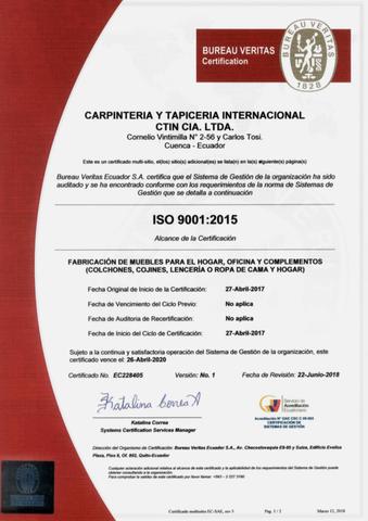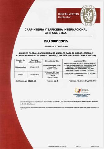 Somos la primera empresa de muebles en obtener la Certificación ISO 9001-2015 en América Latina, todos nuestros productos están fabricados bajo los estándares más altos de calidad y son elaborados minuciosamente por un equipo humano que cuida los detalles para que cada pieza sea perfecta. Buscamos un mejoramiento continuo que nos permita seguir creciendo y cumpliendo nuestros objetivos.